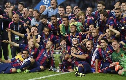| Les joueurs du FC Barcelone posent avec le trophée de la Ligue des champions, le 6 juin à Berlin. |