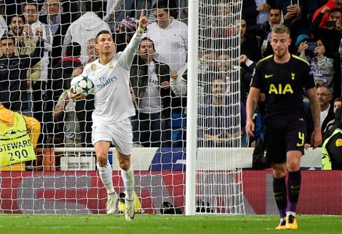 | Cristiano Ronaldo inscrit le but de l'égalisation pour le Real Madrid face à Tottenham à Santiago Bernabeu, le 17 octobre |