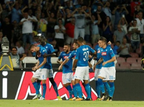 | Les joueurs de Naples à la fête après le but du break, sur penalty, par Jorginho (gauche), contre l'OCG Nice, le 16 août à San Paolo. |