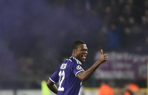 | Le buteur d'Anderlecht, Chancel Mbemba, communie avec les supporteurs du club après son but contre Galatasaray en Ligue des champions, le 26 novembre à Bruxelles |
