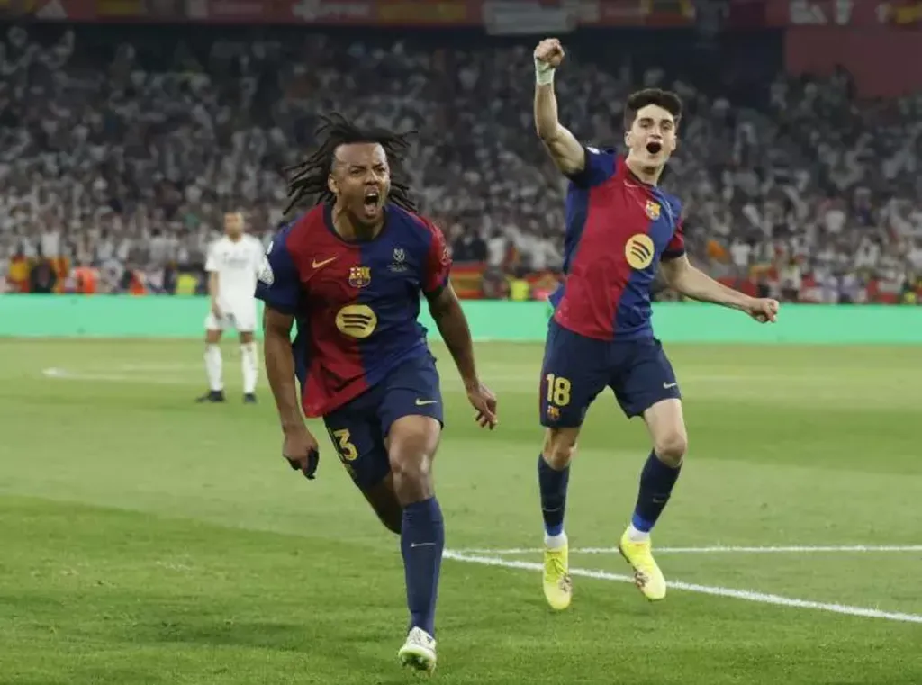 | Les Barcelonais vainqueurs du Real Madrid en finale de la Coupe du Roi avec un but de Jules Koundé, le 26 avril à Séville. |