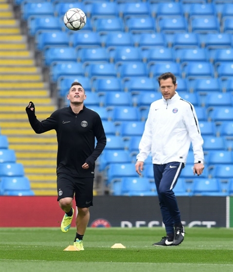 | Le milieu de terrain du PSG, Marco Verratti (gauche), s'entraîne à part dans le stade de Manchester City, le 11 avril. |