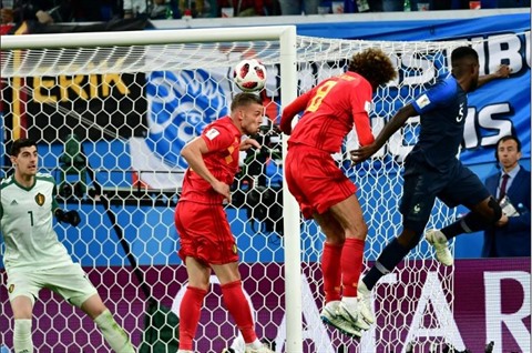 | La France et la Belgique opposées lors du Mondial, avec ici le but de la victoire de Samuel Umtiti (droite), le 10 juillet 2018 à Saint-Pétersbourg, s'affrontent pour une revanche en Ligue des nations. |