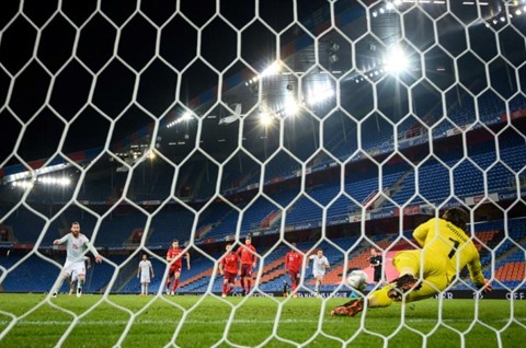 | Le défenseur espagnol Sergio Ramos (gauche) rate son penalty lors du lors du match de Ligue des Nations face à la Suisse, à Bâle, le 14 novembre |