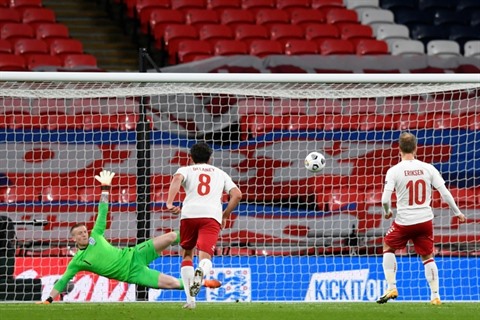 | Le milieu danois Christian Eriksen (droite) marque sur penalty lors du match de Ligue des nations face à l'Angleterre, à Wembley, le 14 octobre. |