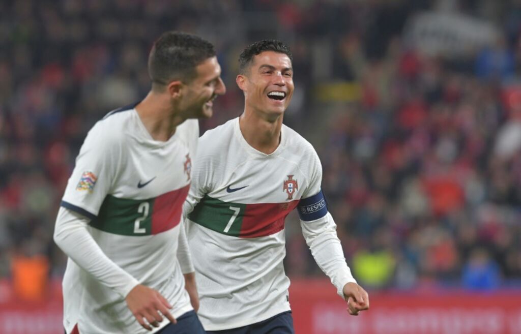 | La joie de Diogo Dalot (gauche), auteur d'un doublé pour le Portugal, et de Cristiano Ronaldo, face à la République tchèque, en Ligue des nations, le 24 septembre 2022 à Prague. |