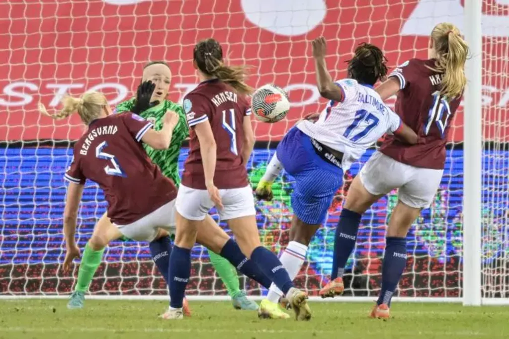 | La Française Sandy Baltimore inscrit un but contre la Norvège en Ligue des nations, le 8 avril à Oslo. |