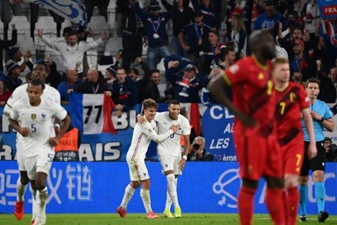 | Kylian Mbappé célèbre avec Antoine Griezmann son but pour l'égalisation des Bleues contre la Belgique en Ligue des nations à Turin, le 7 octobre. |