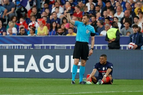 | Kylian Mbappé blessé contre le Danemark en match comptant pour la Ligue des nations, le 3 juin au Stade de France. |
