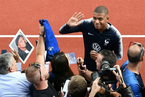 | L'attaquant des Bleus, Kylian Mbappé (centre), salue les supporters aux centre d'entraînement de Clairefontaine-en-Yvelines, le 3 septembre. |
