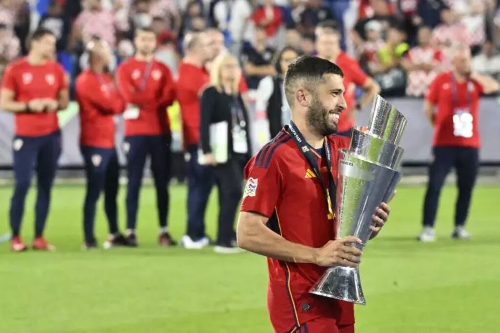 | Le capitaine espagnol Jordi Alba avec le Trophée de la Ligue des nations, le 18 juin à Rotterdam. Photo : AFP/VNA/CVN |