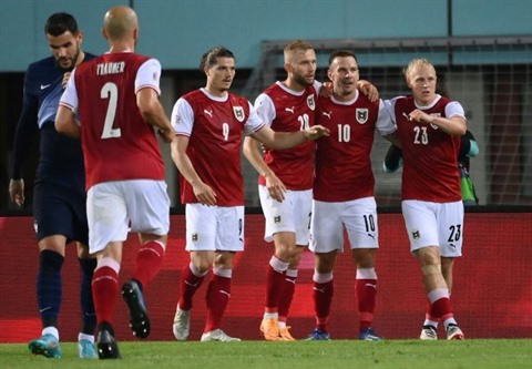 | L'attaquant autrichien Andreas Weimann (2e à droit), félicité par ses coéquipiers, après avoir ouvert le score contre la France, lors de leur match de Ligue des nations, le 10 juin au Stade Ernst Happel à Vienne |
