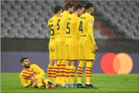 | La défense du FC Barcelone sur un coup franc du Bayern Munich lors du dernier match de poule à l'Allianz Arena, le 8 décembre. |