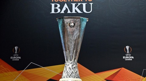 | Le trophée de la Ligue Europa exposé lors du tirage au sort des 8e de finale aller, le 22 février à Nyon. |