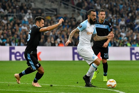 | L'attaquant de Marseille Konstantinos Mitroglou (droite) contre la Lazio Rome en Ligue Europa, le 25 octobre à Marseille. |