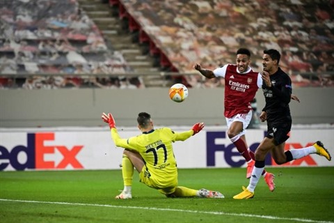 | L'attaquant gabonais d'Arsenal, Pierre-Emerick Aubameyang, marque contre Benfica, lors du 16e de finale retour de la Ligue Europa, le 25 février à Athènes. |