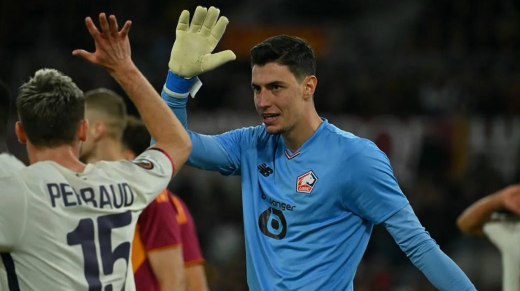 | Le gardien turc du LOSC Berke Özer a arrêté trois penalties entre la 82e et la 85e minute pour empêcher Rome d'égaliser. |