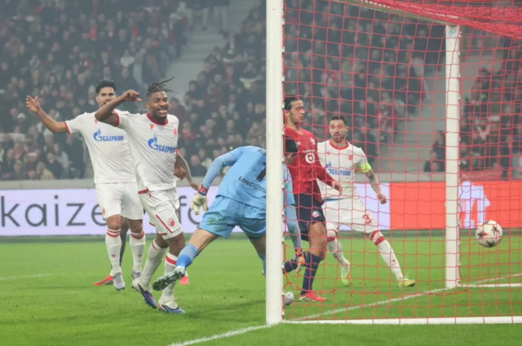 | Le défenseur de l'Étoile Rouge, Franklin Tebo Uchenna, inscrit un but face à Lille, à Villeneuve d'Ascq, le 19 février. |