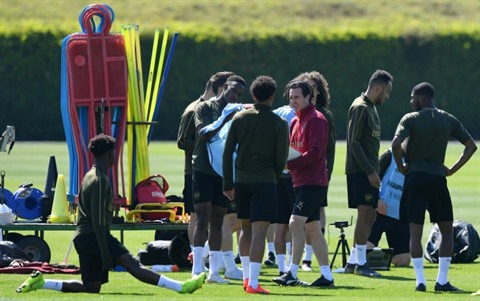 | L'entraîneur espagnol d'Arsenal, Unai Emery (centre), échange avec ses joueurs au centre d'entraînement du club à Colney, en banlieue de Londres, le 21 mai. |