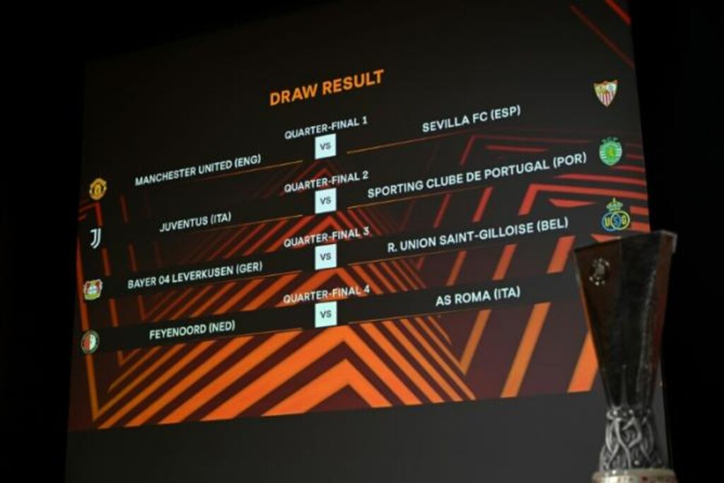 | Le tirage au sort des quarts de finale de l'Europa League, le 17 mars 2023 à Nyon (Suisse). |