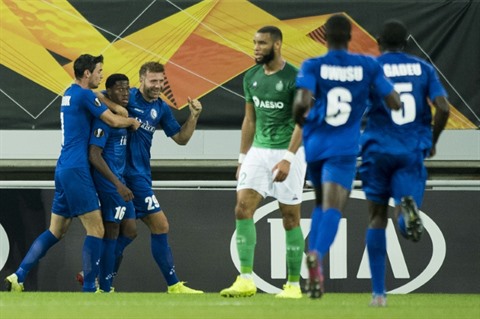 | Les joueurs de La Gantoise fêtent leur deuxième but face à Saint-Étienne, en Ligue Europa, le 19 septembre à Gand. |