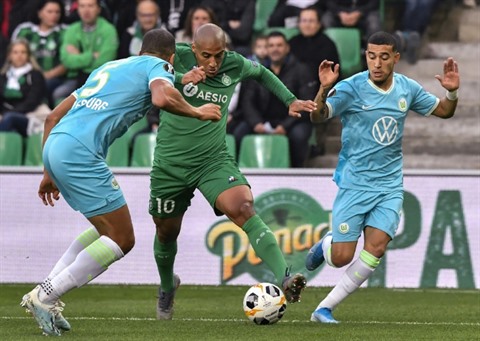 | Le milieu de Saint-Étienne Wahbi Khazri (centre) entre deux joueurs de Wolfsburg en Ligue Europa, le 3 octobre à Geoffroy-Guichard. |