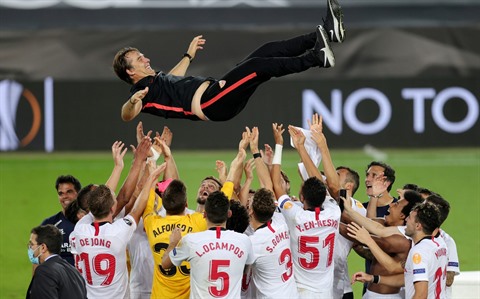 | L'entraîneur de Séville, Julen Lopetegui, célébré par ses joueurs après leur victoire sur l'Inter Milan. |