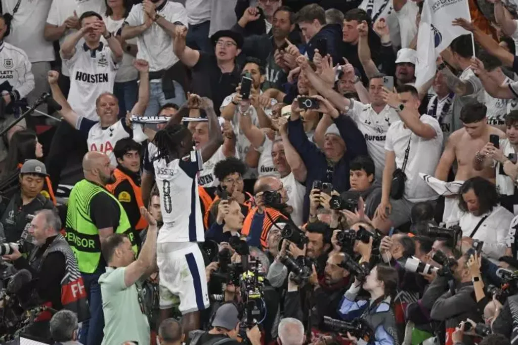 | Le joueur de Tottenham, Yves Bissouma, célèbre au milieu des supporters la victoire en finale de la Ligue Europa face à Manchester United (1-0), le 21 mai à Bilbao. |