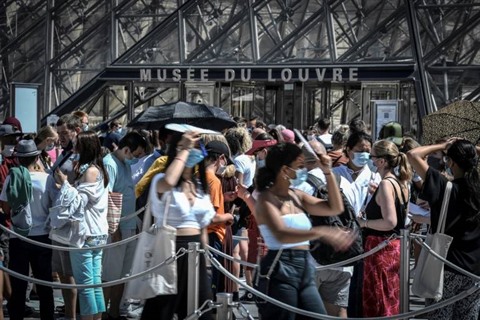 | Des visiteurs devant l'entrée du Louvre, le 6 août à Paris. |