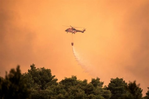 | Un hélicoptère bombardier d'eau luttant contre un incendie sur l'île d'Eubée, au nord-est d'Athènes, le 13 août. |