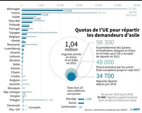 | Quotas de l'UE pour répartir les demandeurs d'asile: quotas par pays, places promises et personnes réparties. |
