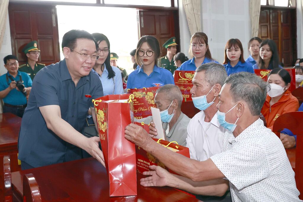 | Le président de l’AN, Vuong Dinh Huê (gauche), remet des cadeaux du Têt à des personnes démunies à An Giang (Sud). |