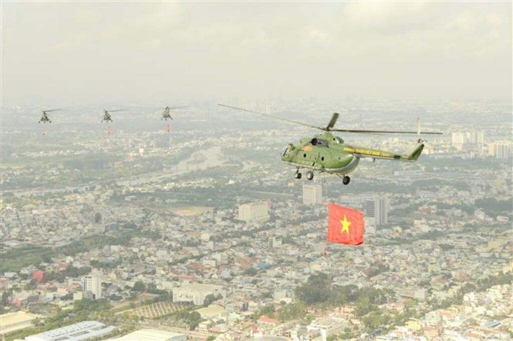 | Un hélicoptère s'entraîne pour le défilé du 30 avril, à Hô Chi Minh-Ville.. |