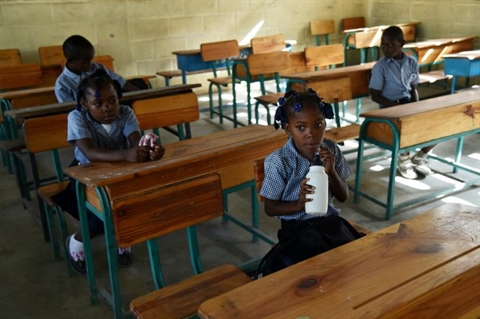 | Des élèves sont assis derrière leur bureau le jour de la rentrée à l'école publique de Tabarre, dans la banlieue de Port-au-Prince, le 5 septembre. |