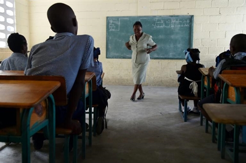 | Une institutrice parle à ses élèves le jour de la rentrée à l'école publique de Tabarre, dans la banlieue de Port-au-Prince, le 5 septembre. |