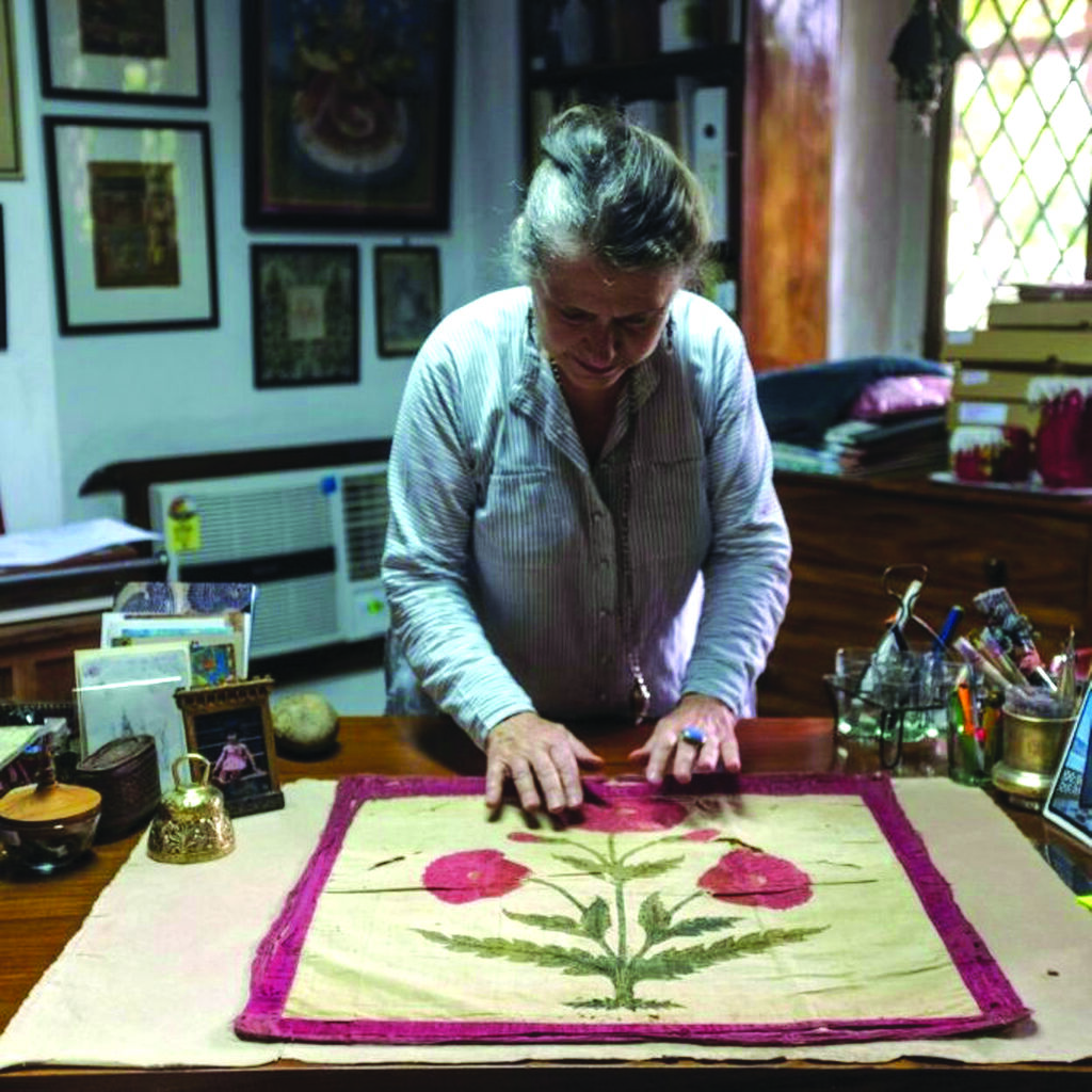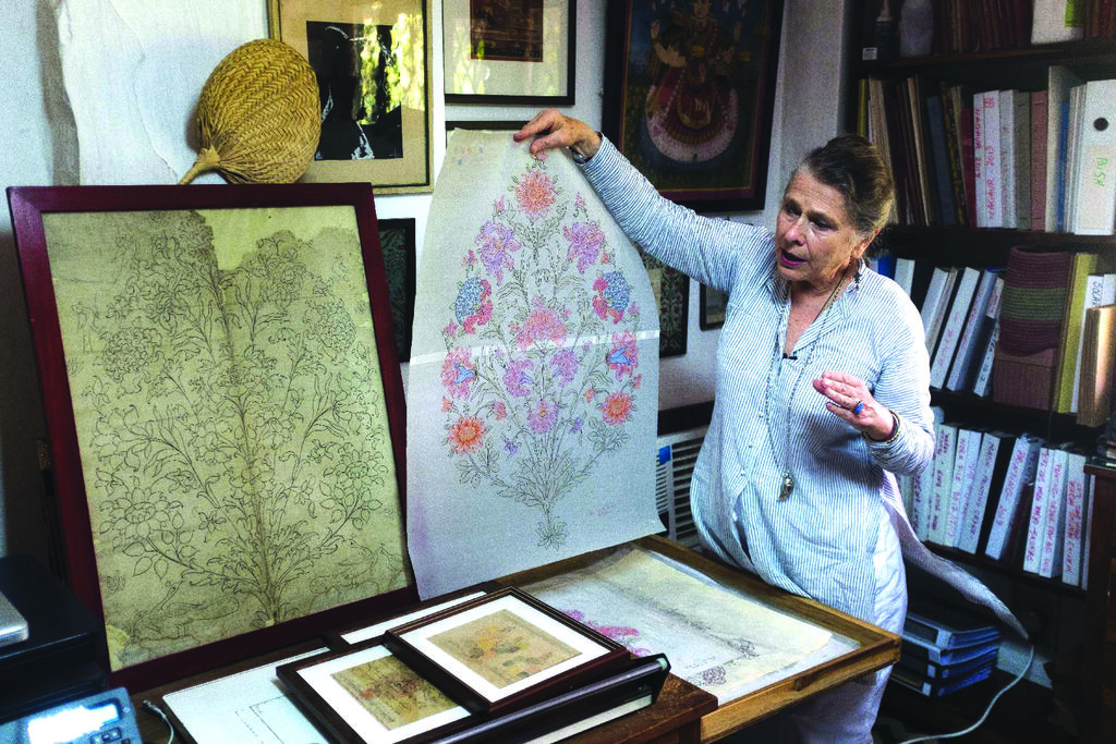 | Brigitte Singh montre un motif d’impression de sa création inspirée par un dessin du XIXe siècle pour papier peint, à Amber (Inde). |