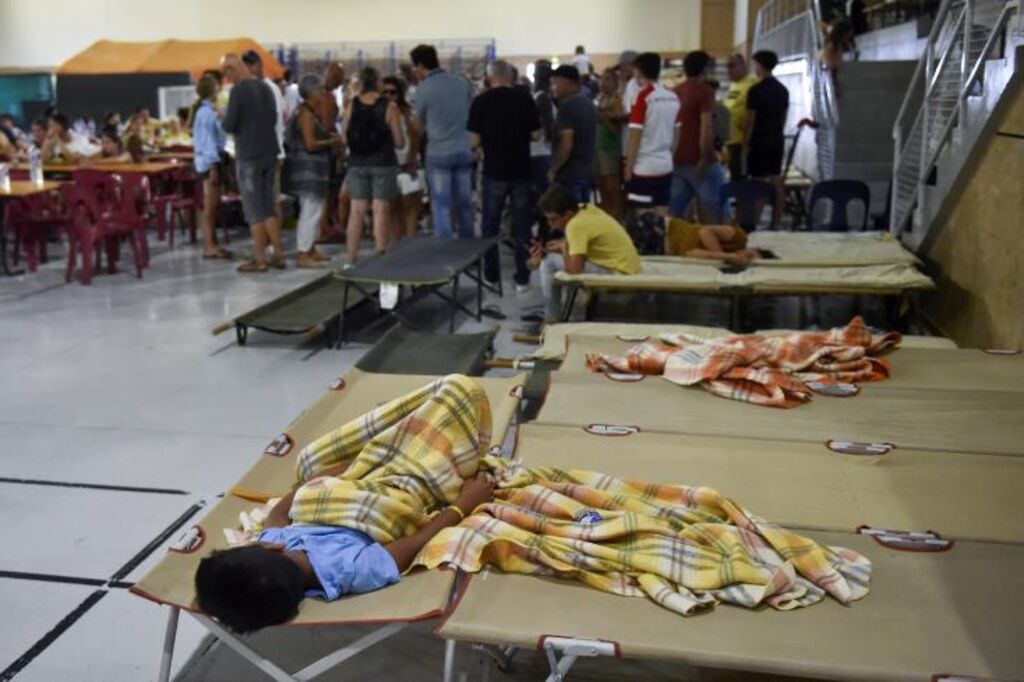 | Des personnes évacuées installées dans un gymnase transformé en centre d'accueil temporaire après un incendie à Argelès-sur-Mer, le 15 août dans les Pyrénées-Orientales. |