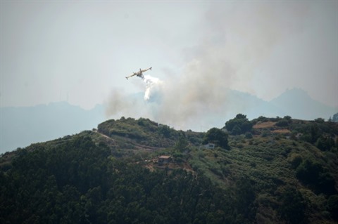 | Un avion bombardier d'eau Canadair survole un massif forestier touché par l'incendie sur l'île espagnole de Grande Canarie, le 19 août. |