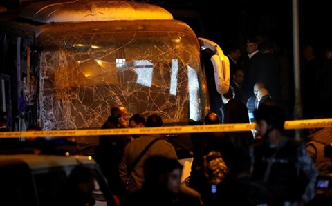 | La police inspecte le bus de touristes vietnamiens après l’attaque à la bombe dont il a été victime près de Gizeh, en Égypte. |