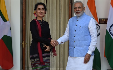 | Le Premier ministre indien Narenda Modi et la conseillère d’État et la ministre des Affaires étrangères du Myanmar, Aung San Suu Kyi, le 19 octobre à New Delhi. |