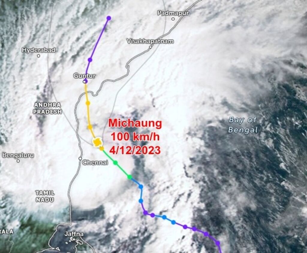 Le cyclone Michaung devrait atterrir mardi matin 5 décembre sur la côte de l'État d'Andhra Pradesh, dans le Sud de l'Inde, selon le service météorologique, qui prévoit des vents soutenus de 90 à 100 km/h (56 à 62 mph), avec des rafales à 110 km/h. Les autorités de l'Andhra Pradesh et du Tamil Nadu voisin étaient en état d'alerte maximale face aux dégâts, ont indiqué les responsables des deux États, et ont averti les pêcheurs de ne pas s'aventurer dans la mer.