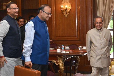 | Le ministre indien des Finances, Arun Jaitley (centre), arrive au palais présidentiel à New Delhi, le 28 février 2015. |