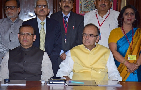 | Le ministre indien des Finances, Arun Jaitley (assis à droite). |