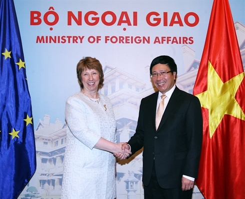 | Le vice-Premier ministre et ministre des Affaires étrangères Pham Binh Minh et la vice-présidente de la Commission européenne, Catherine Ashton, le 12 août à Hanoi. |
