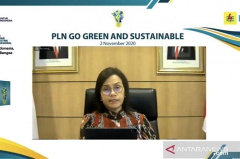 | La ministre indonésienne des Finances, Sri Mulyani Indrawati lors de la discussion en ligne le 2 novembre à Jakarta. |