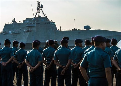 | Des marins indonésiens observent un navire américain arriver dans le port indonésien de Tanjung Perak lors de l'exercice conjoint CARAT. |