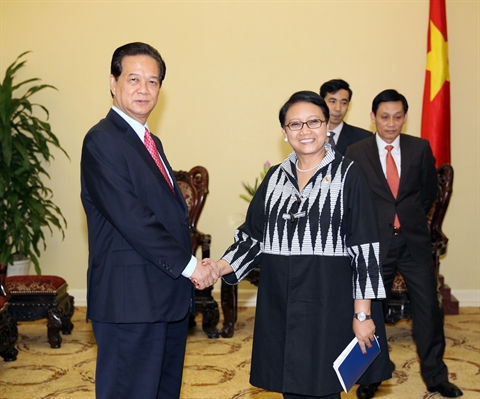 | Le Premier ministre Nguyên Tân Dung et la ministre indonésienne des Affaires étrangères Retno Marsudi, le 3 avril à Hanoi. |
