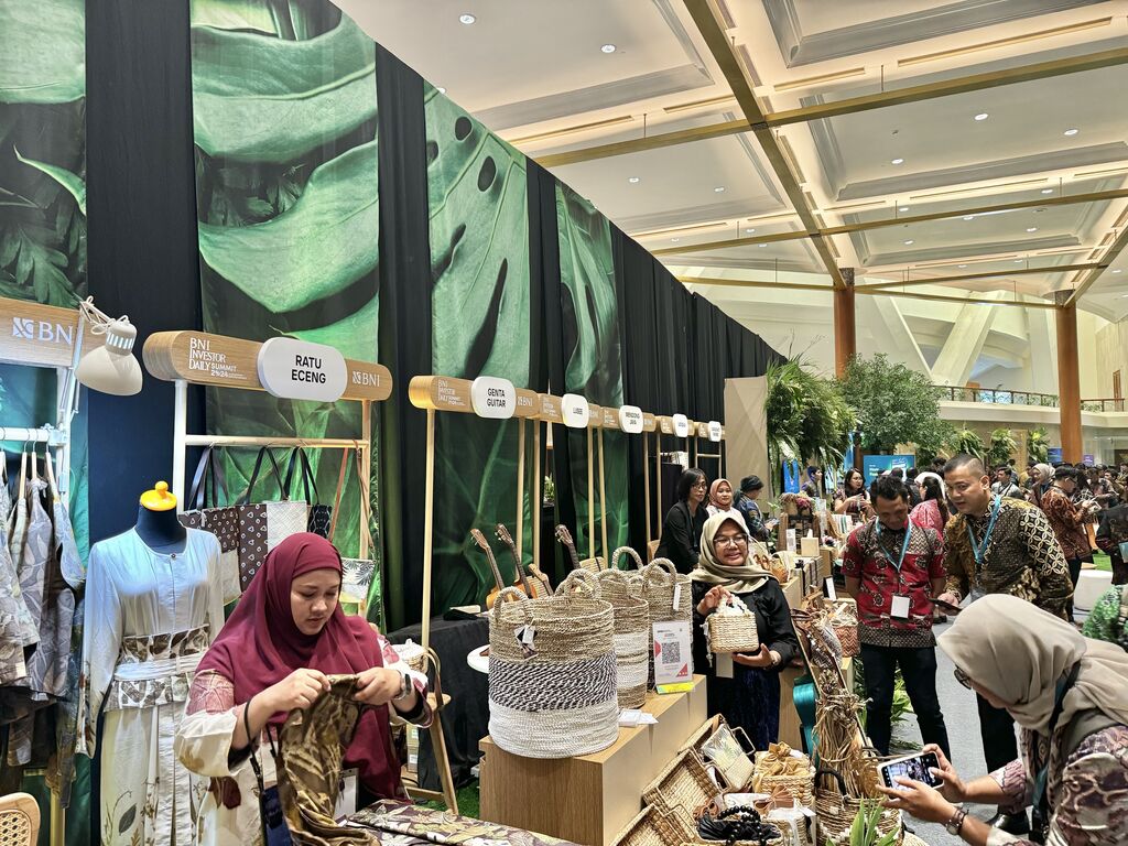 | Présentation de produits artisanaux typiques d'entreprises indonésiennes dans le cadre du Sommet des investisseurs BNI 2024 à Jakarta. |