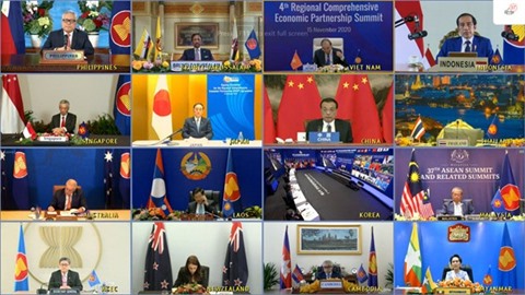 | Une capture d'écran montrant les dirigeants de 15 pays d'Asie-Pacifique et le secrétaire général de l'ASEAN lors de la cérémonie de signature virtuelle du RCEP le 15 novembre. |