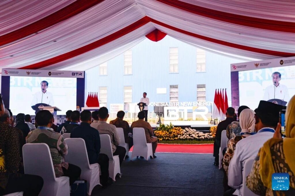 | Le président indonésien Joko Widodo prononce un discours lors de la cérémonie d'inauguration de PT Indonesia BTR New Energy Material (PT BTR) au parc industriel de Kendal dans la province de Java central, en Indonésie, le 7 août 2024. |
